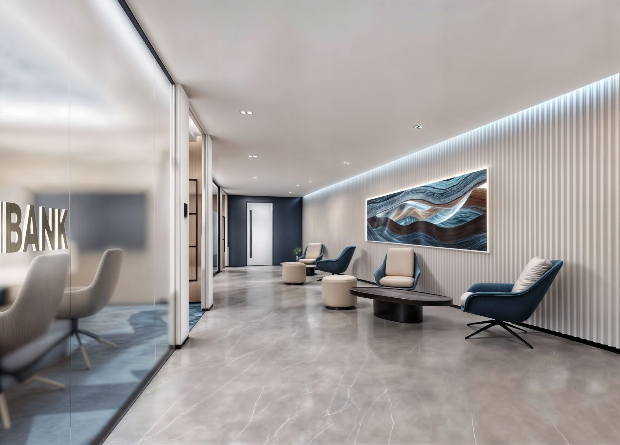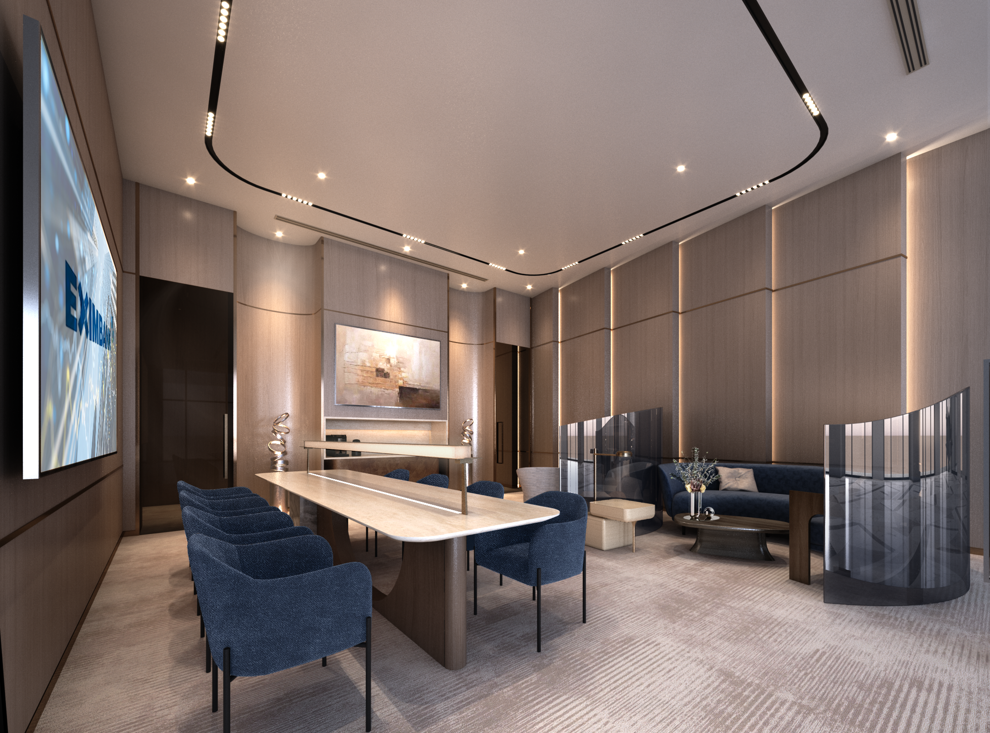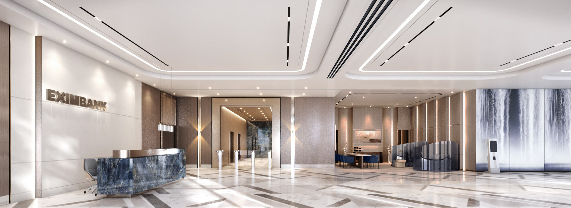 The design is an explicit architectural manifestation of Eximbank’s core values of Transparency, Excellence, and Innovation. The spatial layout prioritizes openness and clarity, particularly in the Endless Blue zones. Excellence is found in the precision of the detailing, while Innovation is driven by the integration of technology within the physical environment.