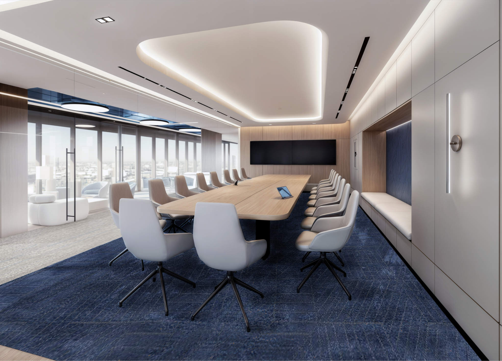 At the executive levels, the narrative deepens into Golden Hour. Richer materials, warmer hues, and refined detailing establish a sense of gravitas and leadership: spaces designed for strategic decision-making, private discussions, and moments of reflection. The journey culminates at the top floor with Perpetual Dawn. This space, with its views to the lake over the tree-lined streets, embodies calm continuity and future vision, with the design suggesting longevity, renewal, and limitless potential