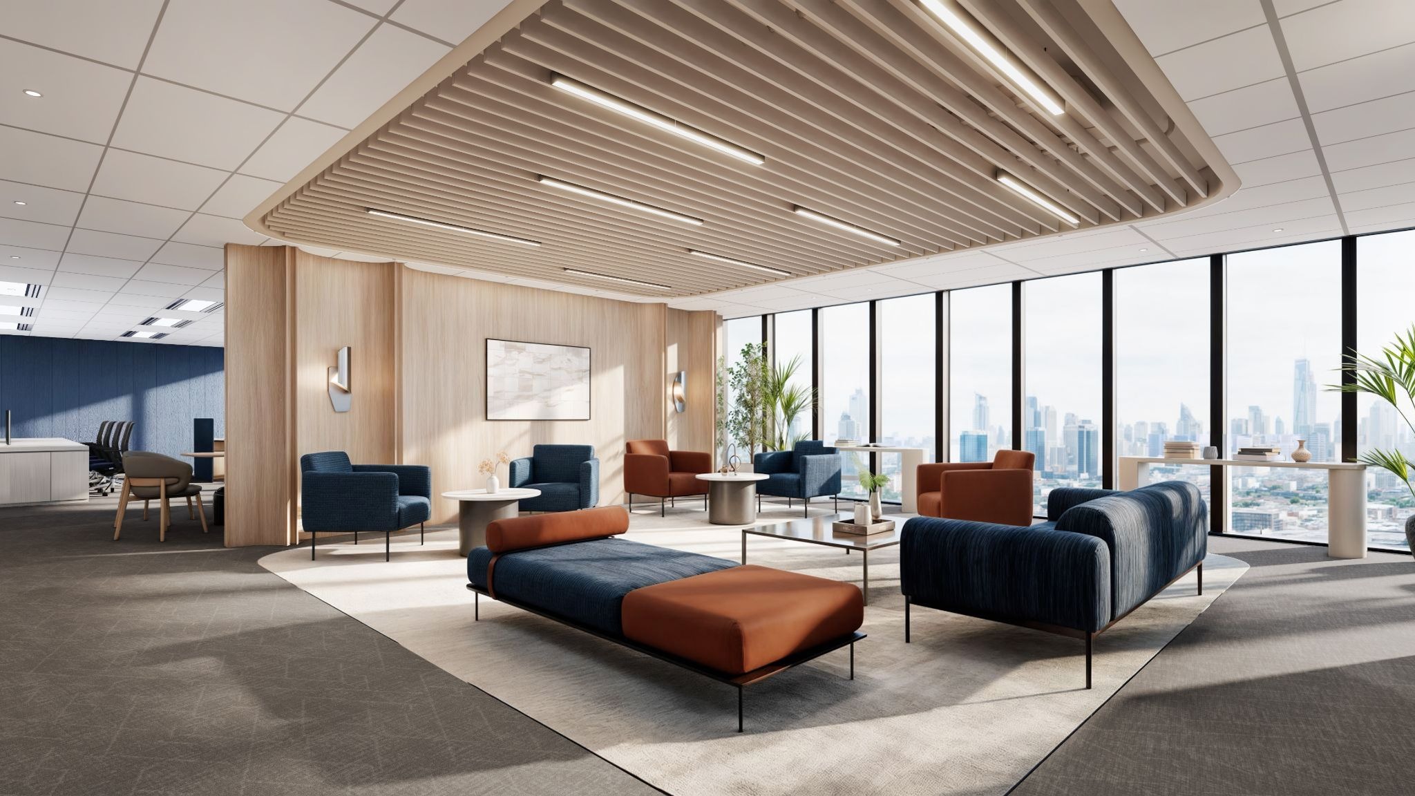 At the executive levels, the narrative deepens into Golden Hour. Richer materials, warmer hues, and refined detailing establish a sense of gravitas and leadership: spaces designed for strategic decision-making, private discussions, and moments of reflection. The journey culminates at the top floor with Perpetual Dawn. This space, with its views to the lake over the tree-lined streets, embodies calm continuity and future vision, with the design suggesting longevity, renewal, and limitless potential